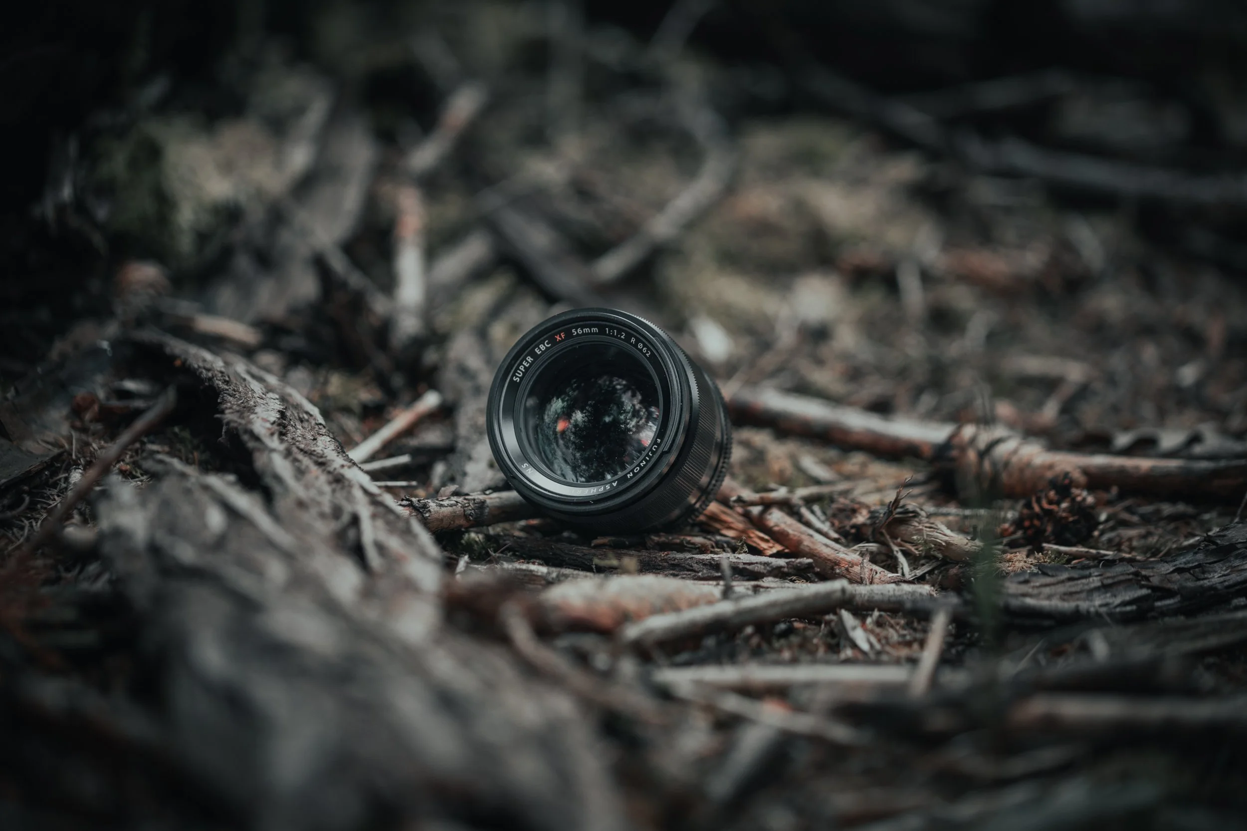 Ich beschloss mir diesen Ort etwas näher anzusehen, doch leider fand ich nichts, was meine Aufmerksamkeit erregen sollte. Für einige interessante Pilze beispielsweise, war es noch zu früh. Ich musste als kreativ werden, denn ich wollte hier unbedingt einige Fotos machen, um wenigstens mit einem guten wieder nach Hause zu kommen. Da ich zunächst kein ansprechendes Motiv gefunden habe, griff ich darauf zurück, was ich eh schon mit mir herumtrug. So nahm ich ein Objektiv aus dem Rucksack und versuchte es irgendwie einigermaßen stimmig zu platzieren. “Produktfotografie in freier Wildbahn” dachte ich mir.